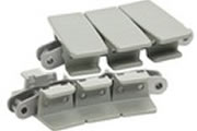 Two-piece chains with a steel roller base chain and plastic top plate.