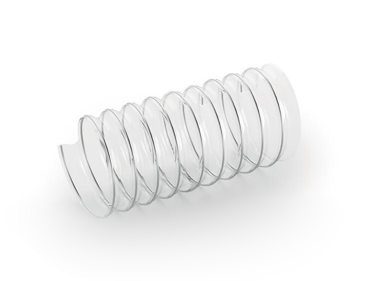 Polyurethane (PU) hose with galvanised steel spiral. Designed for both the suction and transport of dusts, chips and abrasive material. ON DEMAND from Ø 60 available in the self-extinguishing version according to DIN 4102-B1.